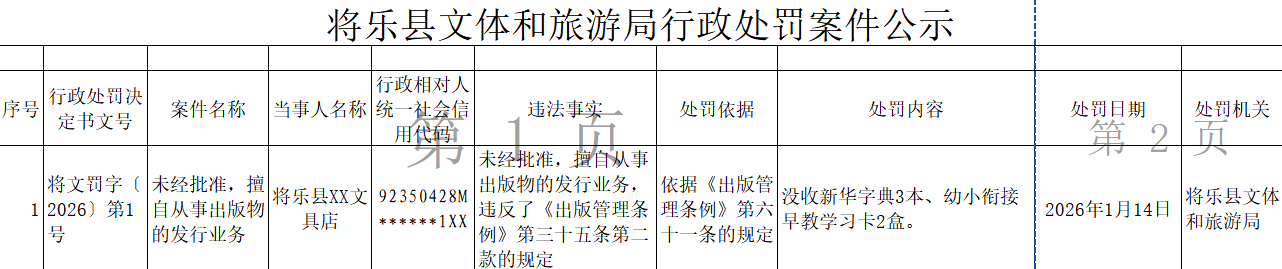 将乐县文体和旅游局行政处罚案件公示(将文罚字〔2026〕第1号)