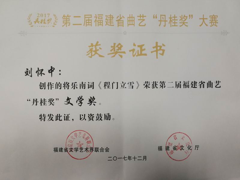 近日,在省文联、省文化厅举办的第二届福建省曲艺“丹桂奖”大赛中,代表三明市参赛的将乐南词《程门立雪》获得大赛节目奖三等奖和新人奖、文学奖、优秀组织奖共4个奖项。其中《程门立雪》荣获大赛南曲业余组节目奖三等奖,作者刘怀中荣获文学奖,演员喻舒悦、路文琳荣获新人奖,演出单位将乐县第一中学荣获优秀组织奖,再一次为我市赢得了荣誉。