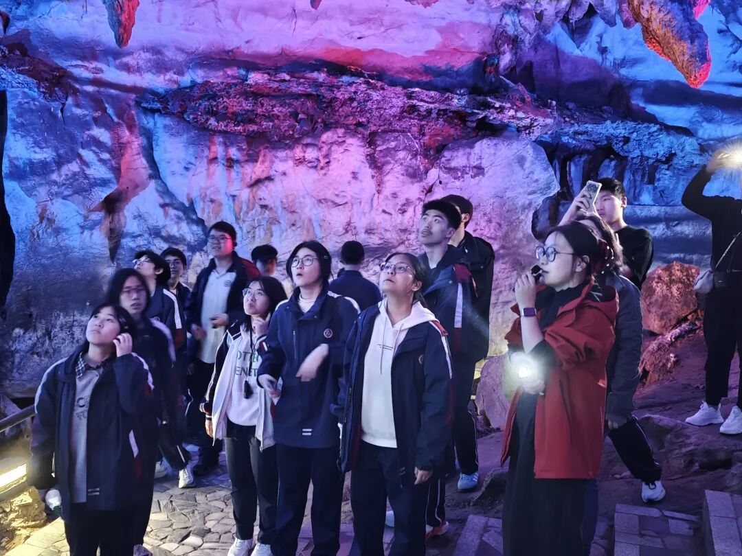 在玉华洞景区,学子们通过讲解员的细致讲解,系统了解了喀斯特地貌的形成与演变,近距离触摸溶洞岩石,观察钟乳石、石笋的地质特征,将课本上的 “地表形态塑造” 知识转化为直观体验。