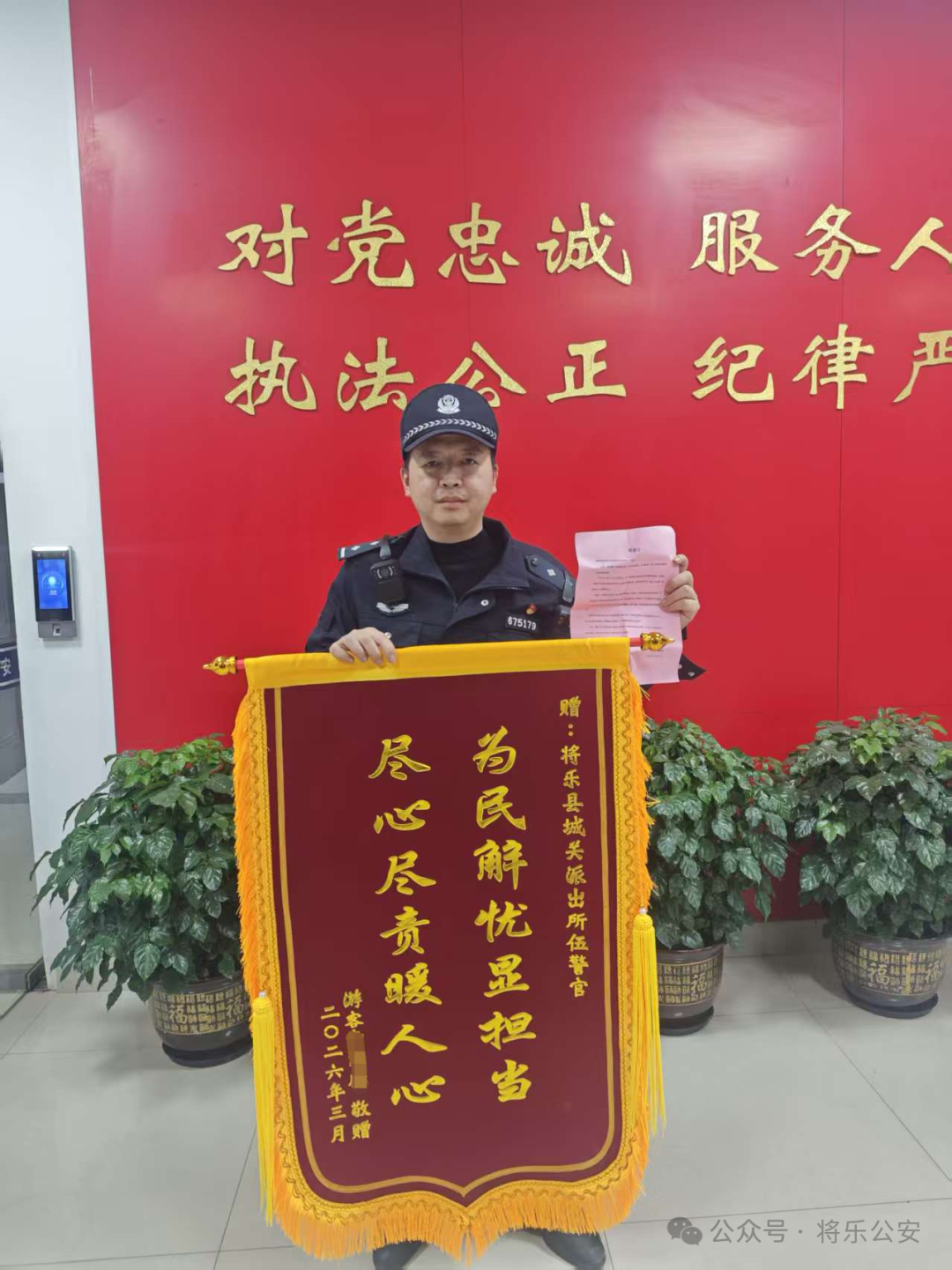近日,童某专程将感谢信和印有“为民解忧显担当,尽心尽责暖人心”的锦旗送到派出所,字里行间满是感激。一面锦旗、一封感谢信,是群众对公安工作的最好认可。