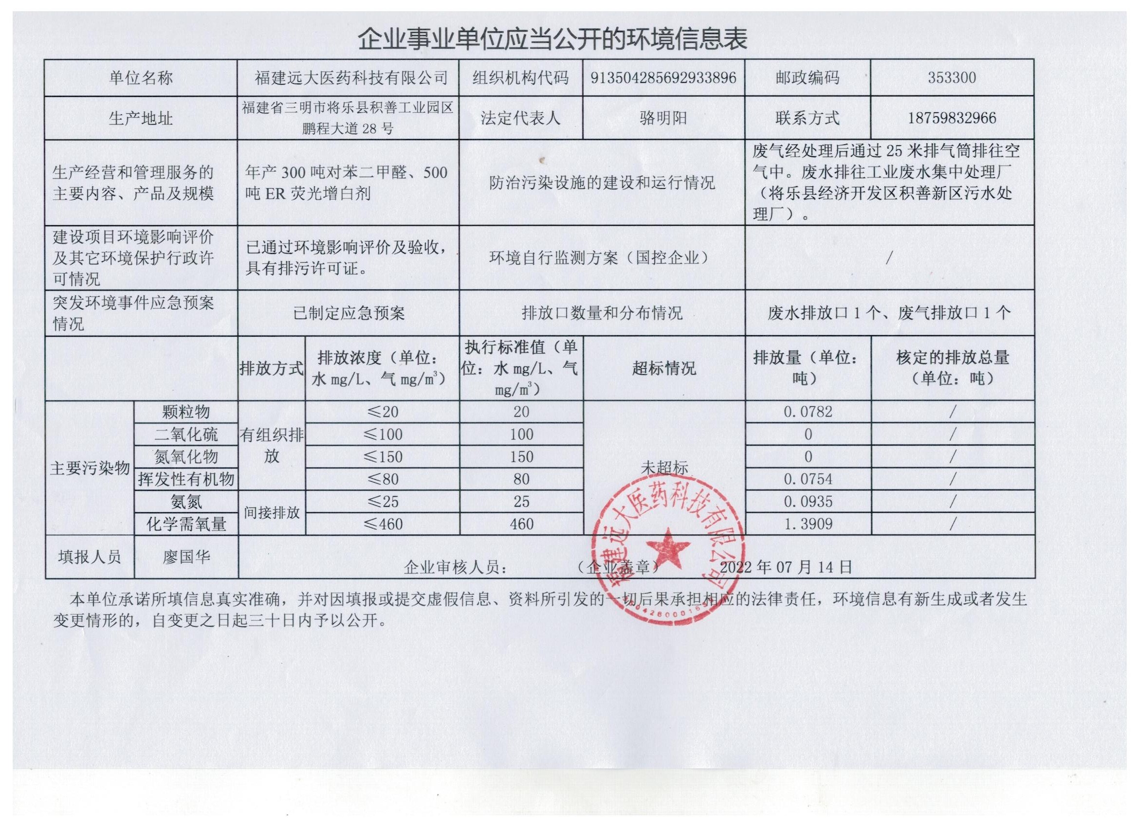 2021年企业事业单位环境信息公开表(福建远大医药科技有限公司)