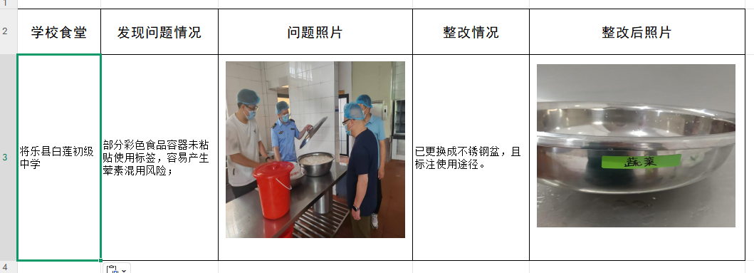 将乐县市场监督管理局高度重视中小学校园食品安全和膳食经费管理突出问题专项整治工作,深入开展督导检查,有效推动存在问题整改,防范化解中小学学生在校集中用餐食品安全风险,守护青少年“舌尖上的安全”。现将部分整治成果公布如下: