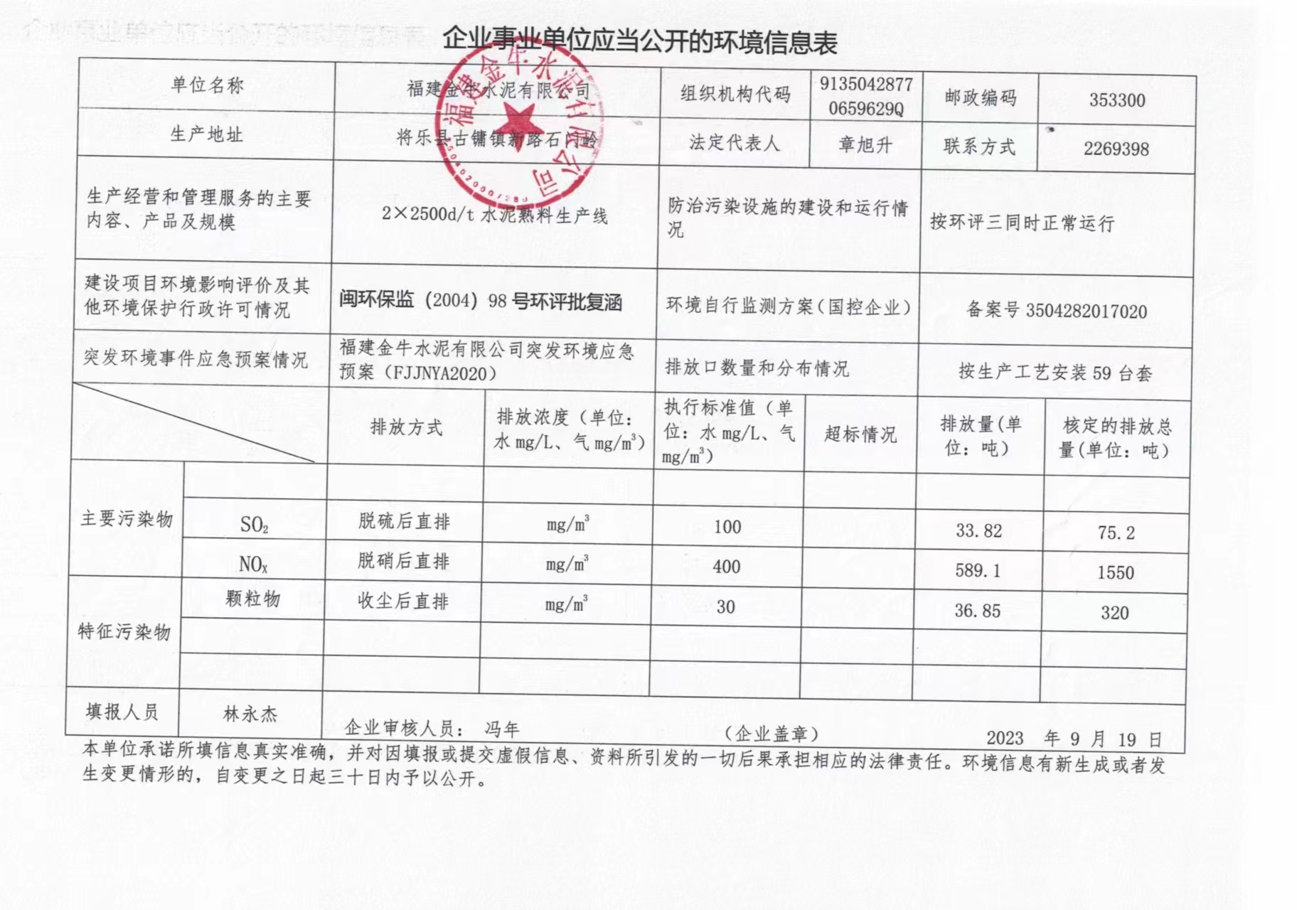 企业事业单位应当公开的环境信息表(福建金牛水泥有限公司)