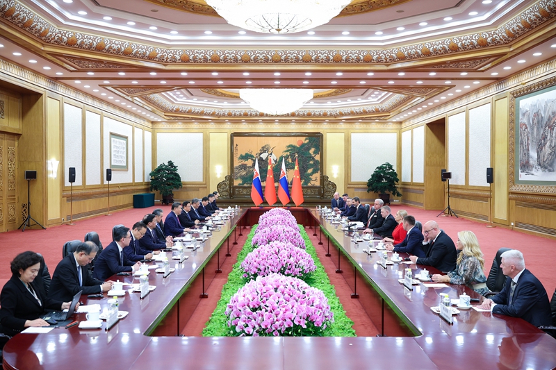 菲佐祝贺中华人民共和国成立75周年,表示,斯方坚定奉行一个中国政策,认为中华人民共和国政府是代表全中国的唯一合法政府。斯方反对任何干涉别国内政的行为,主张尊重各国自主选择的发展道路。此次我携包括多名重要内阁成员和企业家在内的庞大代表团访华,旨在表明斯方对发展对华关系的高度重视和积极意愿。感谢中方给予斯洛伐克公民15天入境免签政策,斯方支持便利两国人员往来,增进相互了解,欢迎更多中国企业赴斯投资,在新能源、基础设施等领域加强合作。斯方赞赏习近平主席提出的三大全球倡议,反对单边主义和霸权主义,愿同中方加强多边沟通协作,推动完善全球治理,促进全人类福祉。斯方愿同中方加强党际交流和治国理政经验交流,积极推动欧盟致力于通过对话磋商妥善处理分歧。
