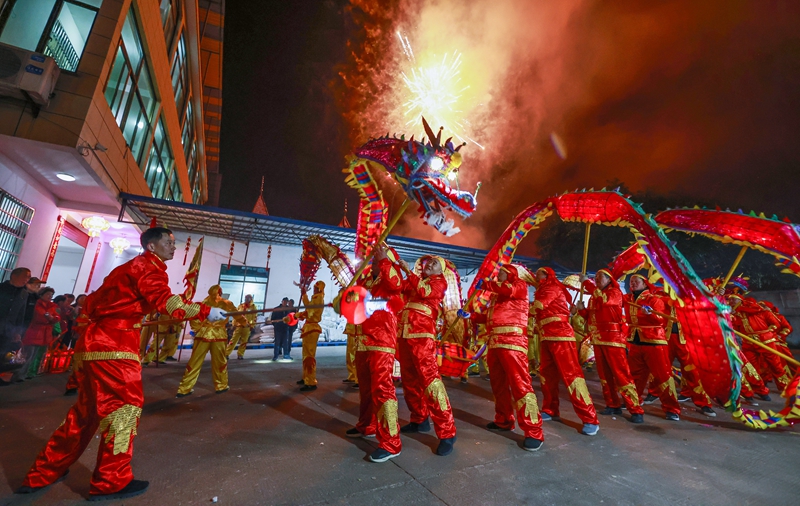2024年2月10日,浙江省诸暨市安华镇矿亭村村民进行舞龙表演,庆祝春节。新华社记者 徐昱 摄